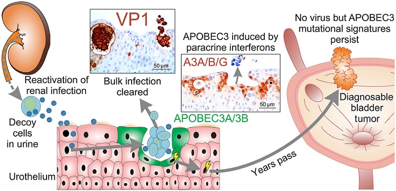 This model explains how APOBEC3 activity may trigger bladder cancer in a virus-infected environment. Persistent BK polyomavirus in kidney tubules can reactivate and release infected “decoy cells” into urine, which then infect the bladder lining. As the virus begins producing new particles, the bladder expels infected cells marked by VP1. During this extrusion process, nearby cells respond to interferon signals by activating APOBEC3A, which damages DNA. Repeated bursts of BKPyV infection create cycles of APOBEC3A/B activity that gradually accumulate mutations, including uracil lesions that persist until the cell divides. Over time, this can initiate tumors defined by APOBEC3A/B mutational patterns, even though the virus is absent in the final cancer.