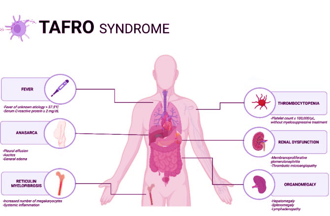 TAFRO syndrome is a once rare illness marked by symptoms like low blood platelet counts, severe body swelling, fever, organ enlargement, and bone marrow issues. iMCD is a disorder involving abnormal growth of lymph node tissue across the body. Both diseases are believed to result from immune system dysfunction. This